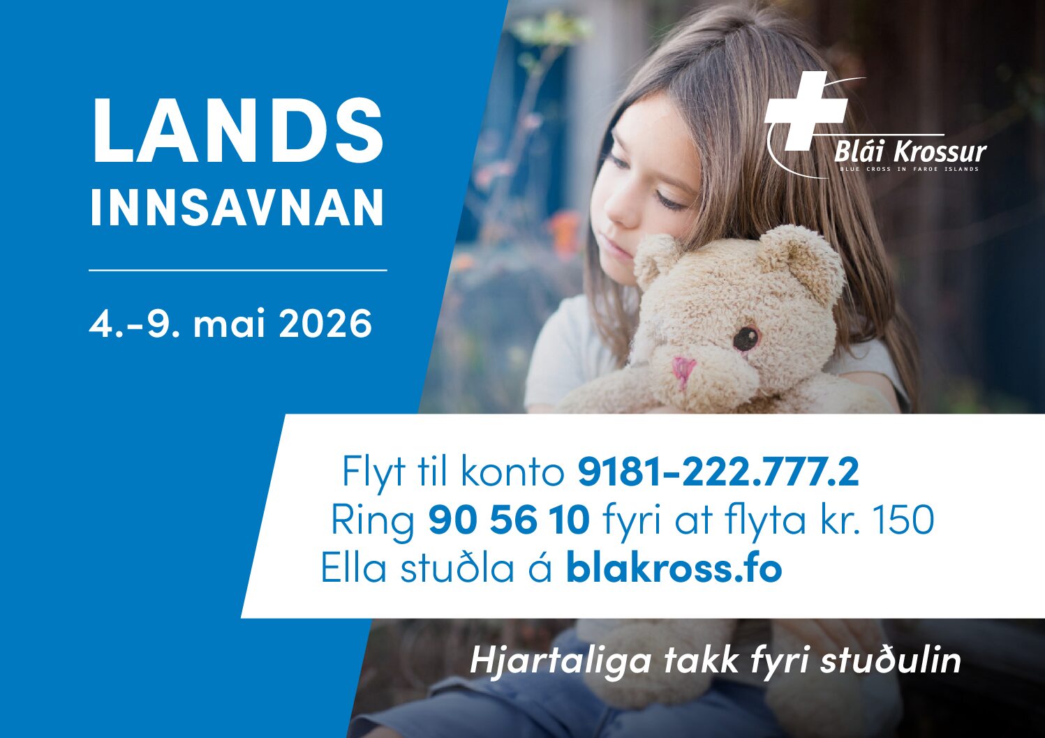 Frá 4. til og við 9. mai, hevur Blái Krossur Føroya sína árligu landsinnsavnan. Allur peningurin fer aftur í ár til fyribyrgingararbeiðið millum børn, ung og familiur, m.a. gjøgnum ‘Títt Rúm’ og ‘Liv Lívið’.